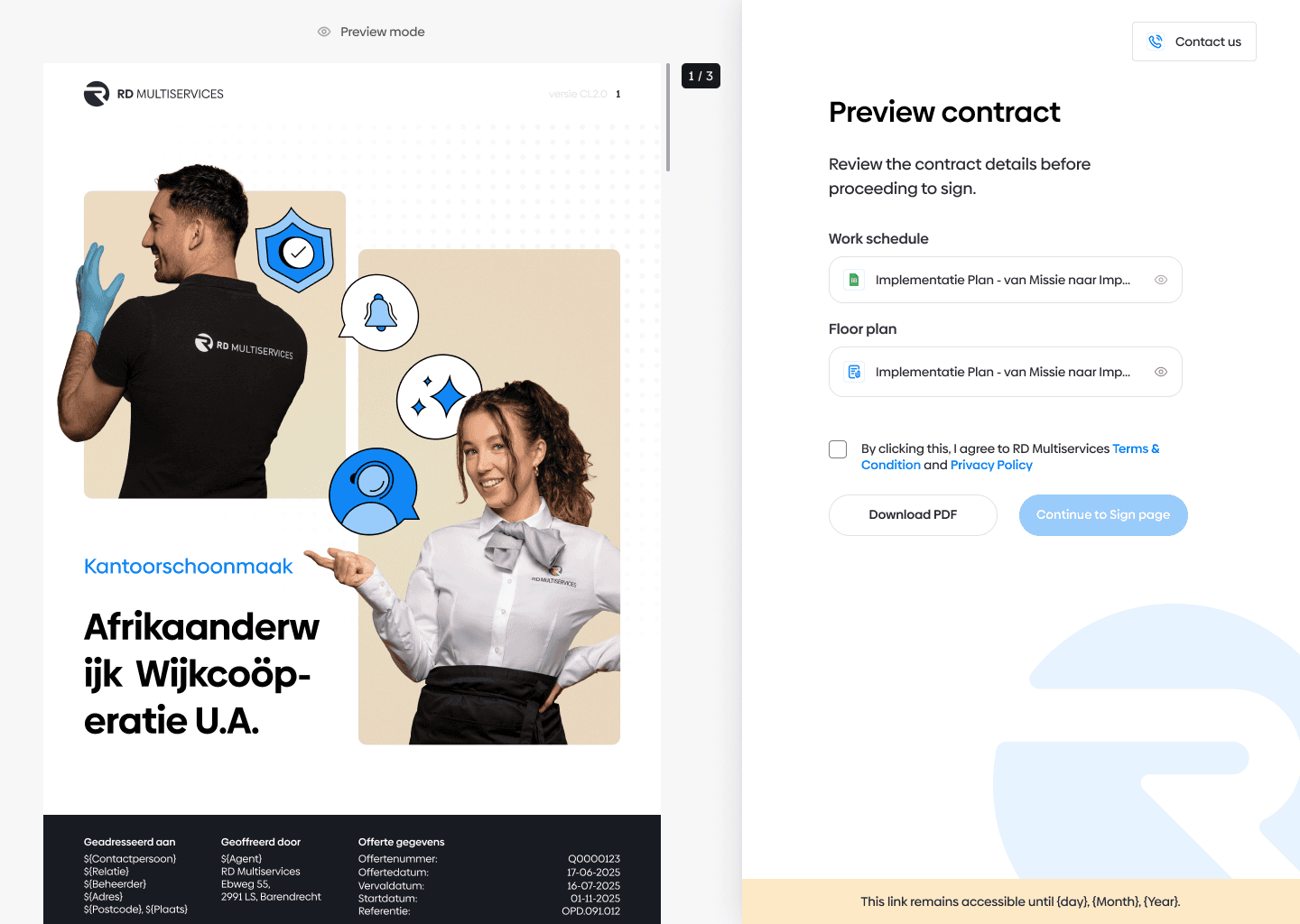 "As a customer, I want to receive, review, and sign contracts easily so that I can complete the process without hassle."