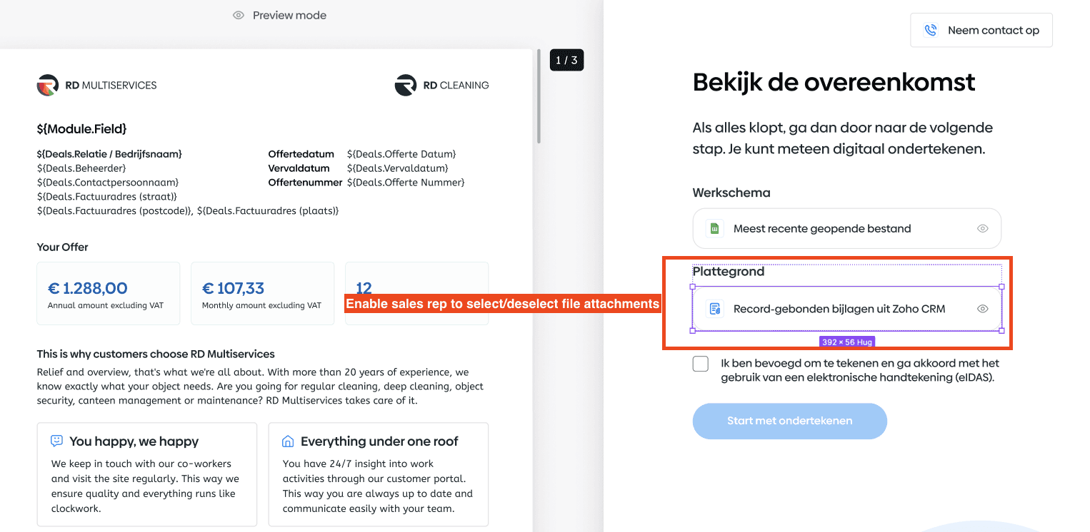 After verifying the signer’s identity through the CRM, users can switch to signing mode and complete the process with a secure e-signature.
