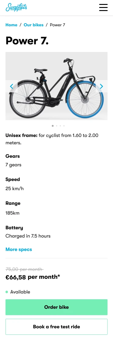 Swapfiets, an Amsterdam-based company, provides a B2C bike subscription service across eight European countries.I joined Swapfiets in 2023 as an intern and have since advanced to the role of UX Designer. My primary focus has been improving the website's user experience through close cooperation with the Marketing team and developers.